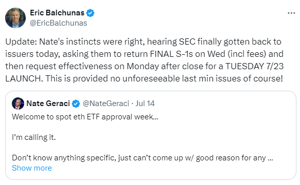 Crypto market: SEC ready for Ethereum ETFs to list on 23
