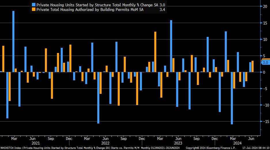 Total housing starts in June up 3% from May, better than +1.8% forecast