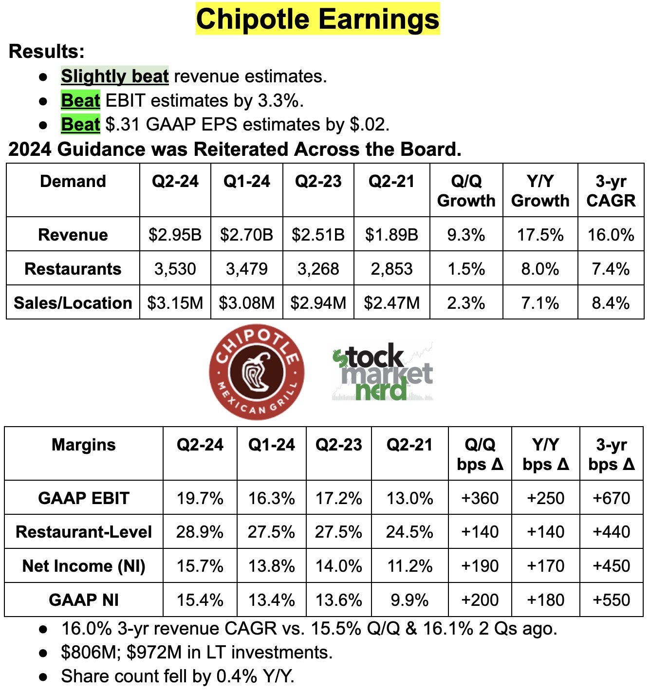 Steve: Extremely outstanding Q2 for when compared to other fast food chains or competitors in an environment where consumer spending is starting to contract. Expansion into the high-income customer segment with healthier products than traditional fast food chains is a good advantage. However, even after the split the stock price is more accessible to investors, current valuation remains quite high for the sector, plus CEO's outlook on potential future margin compression. Steve would be more comfortable with at $43.