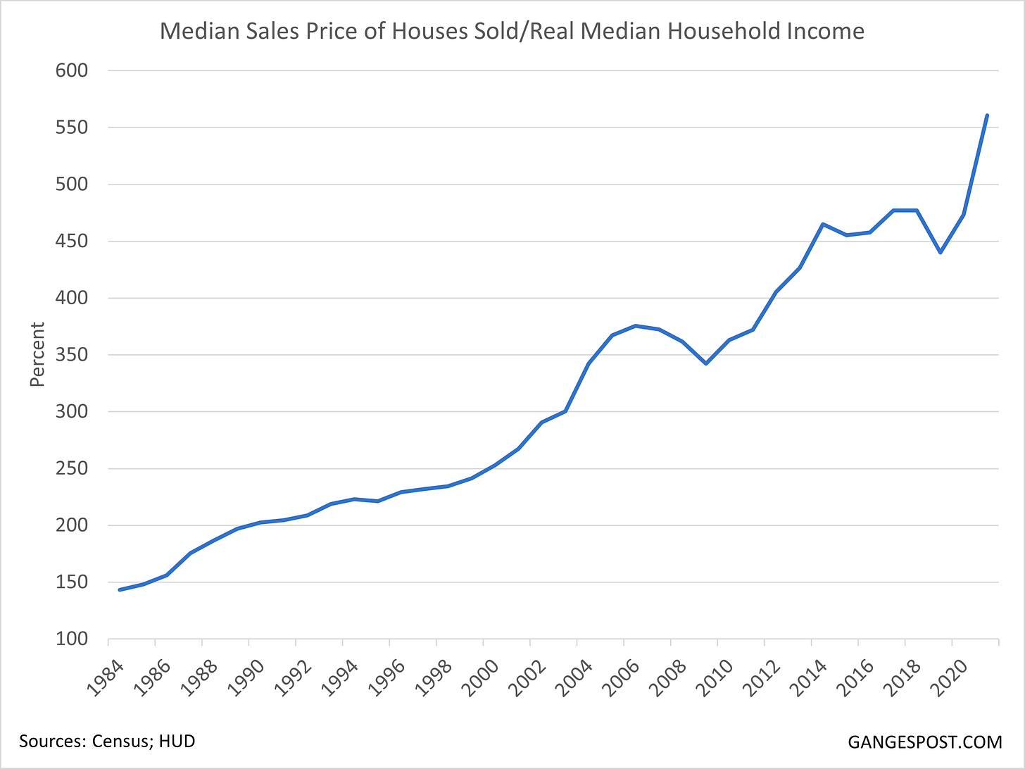 The average price of a home in the US is around 500 thousand USD, 560 times the average household income, causing the homeownership rate to decline rapidly.