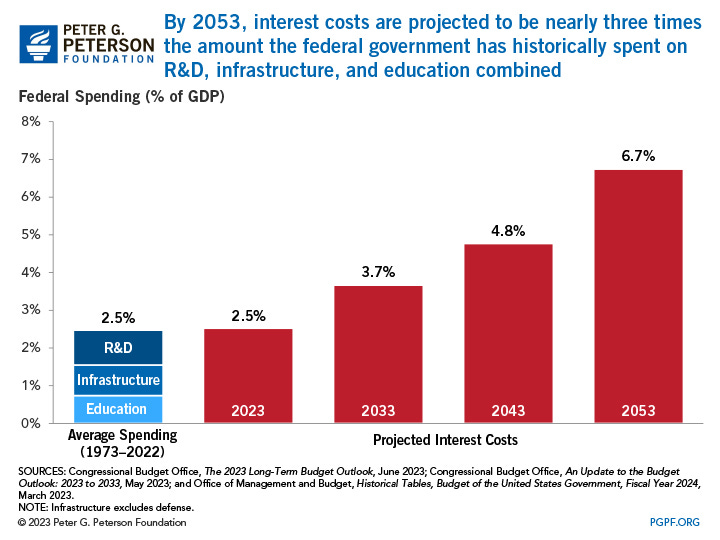 Projected by 2053, interest costs will account for up to 35% of government spending, 3 times higher than R&D, infrastructure, and education combined, marking a record high spending level and ever-growing deficits.