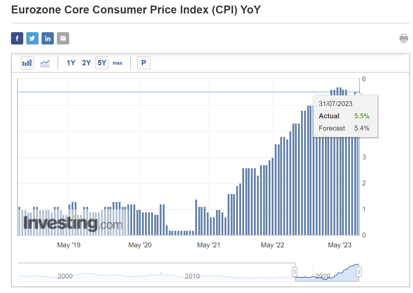 EU core CPI slightly down -0.1% MoM but still strongly up YoY at +5.5%, higher than the expected 5.4%.