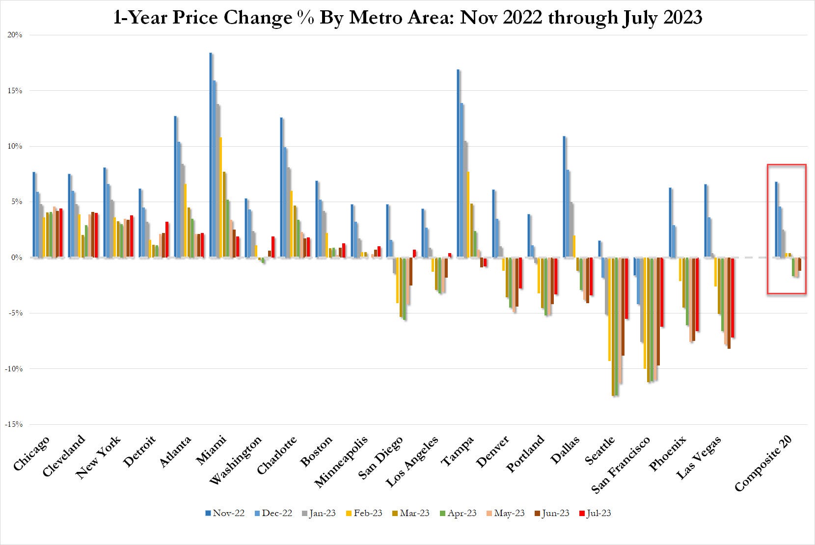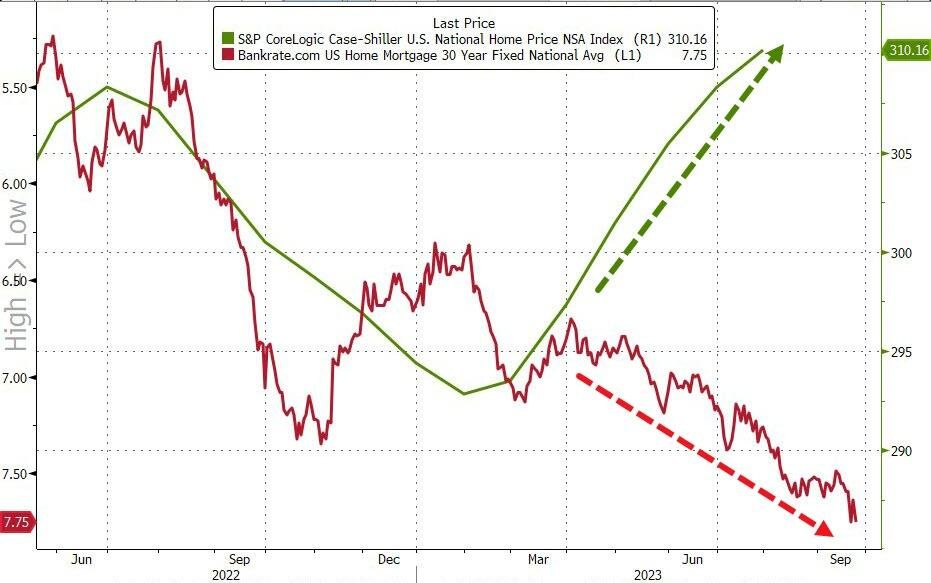 Case-Shiller home prices in July rose 0.9% from the previous month, marking a record high in history. Despite mortgage rates surging above 7.5% - the highest since 2000, home prices have risen for 5 consecutive months.