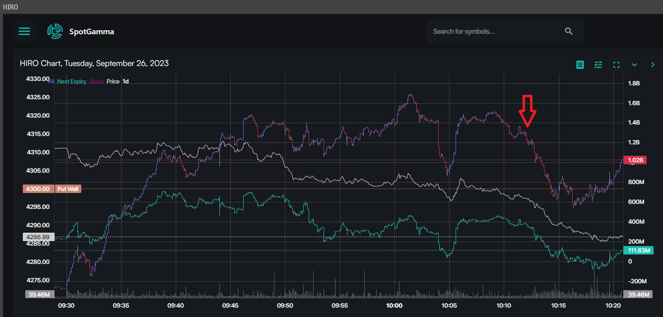 Market continues to weaken today after news of spending negotiations in Congress begins to show lack of prospects and bond yields reverse back to peaks right from the morning session. SPX loses 4300 with steadily increasing selling pressure, starting from tech and gradually spreading to all sectors. Demand for puts surges below SPX~4300 and only temporarily shows signs of stopping when Europe closes.