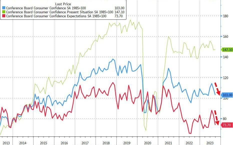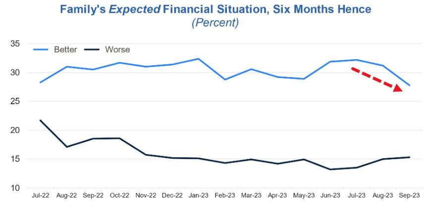 Expectations for the next 6 months have fallen below the recession threshold of 80, reflecting concerns about business conditions, job prospects, and future income.