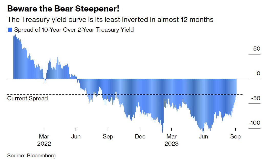 For 15 consecutive months, the yield curve has been inverted as 10-year Treasury bonds have lower yields than 2-year bonds.