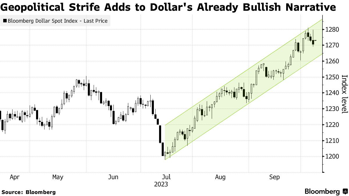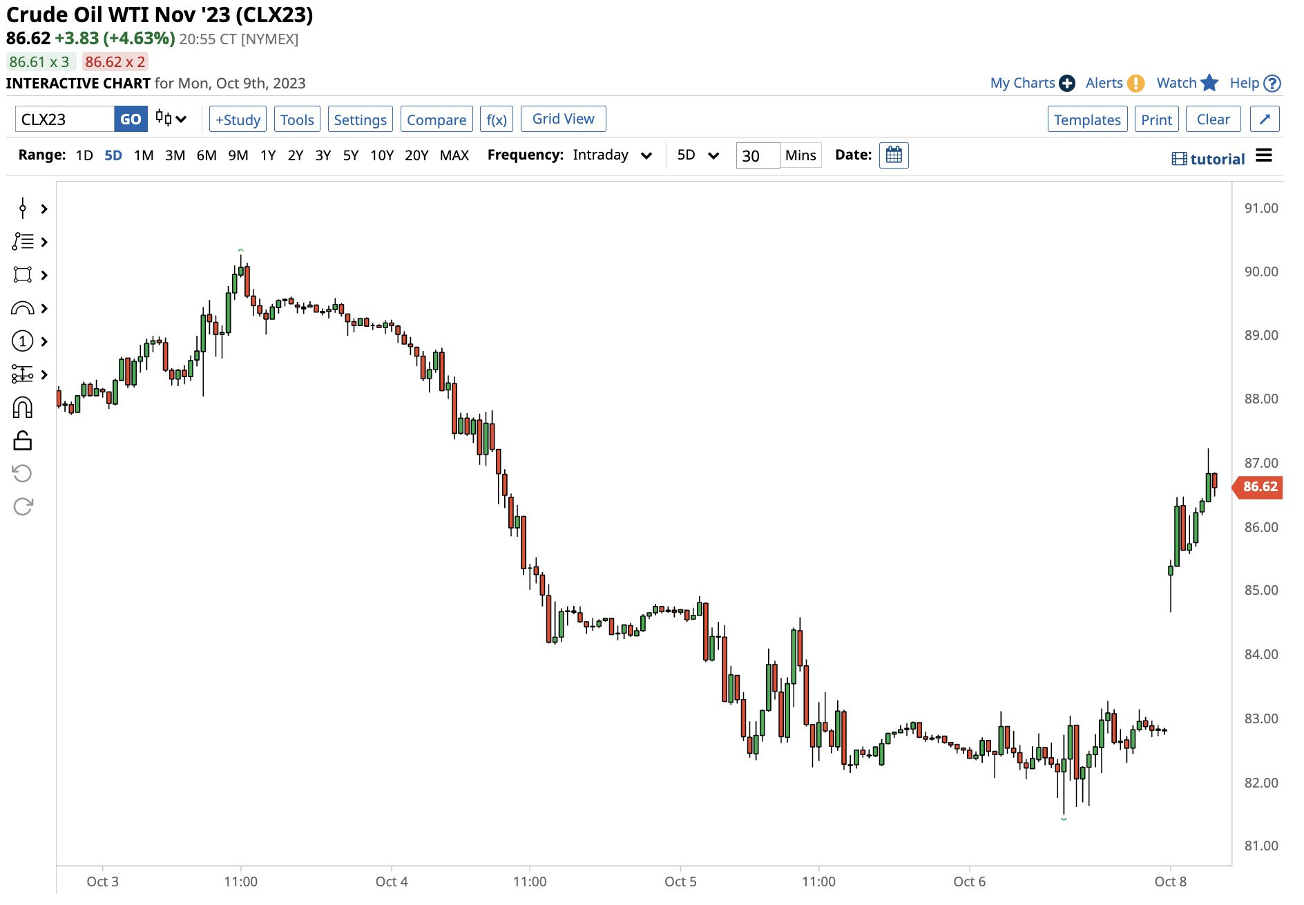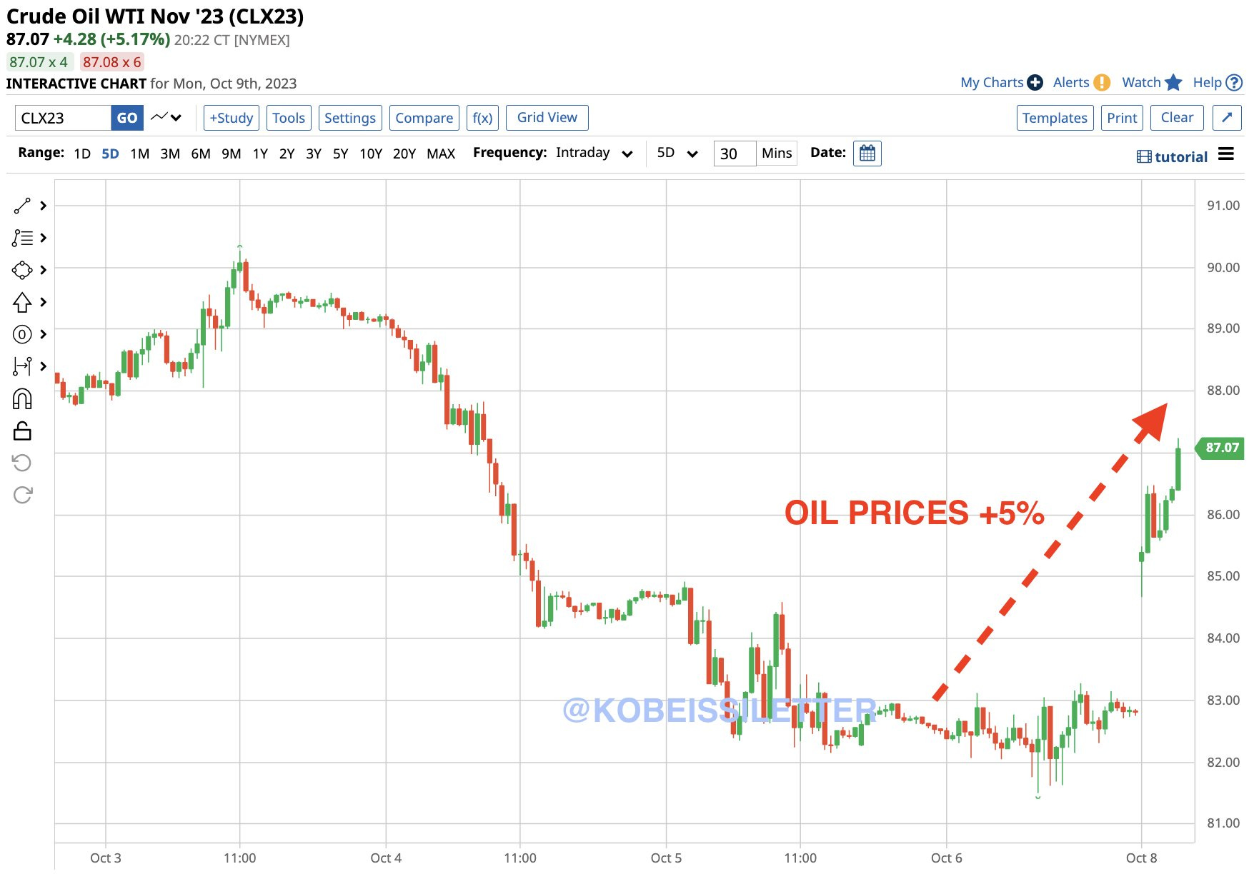 WTI oil price surged above 87 USD/barrel after major conflict erupted between Palestine and Israel, reaching 52-week high.