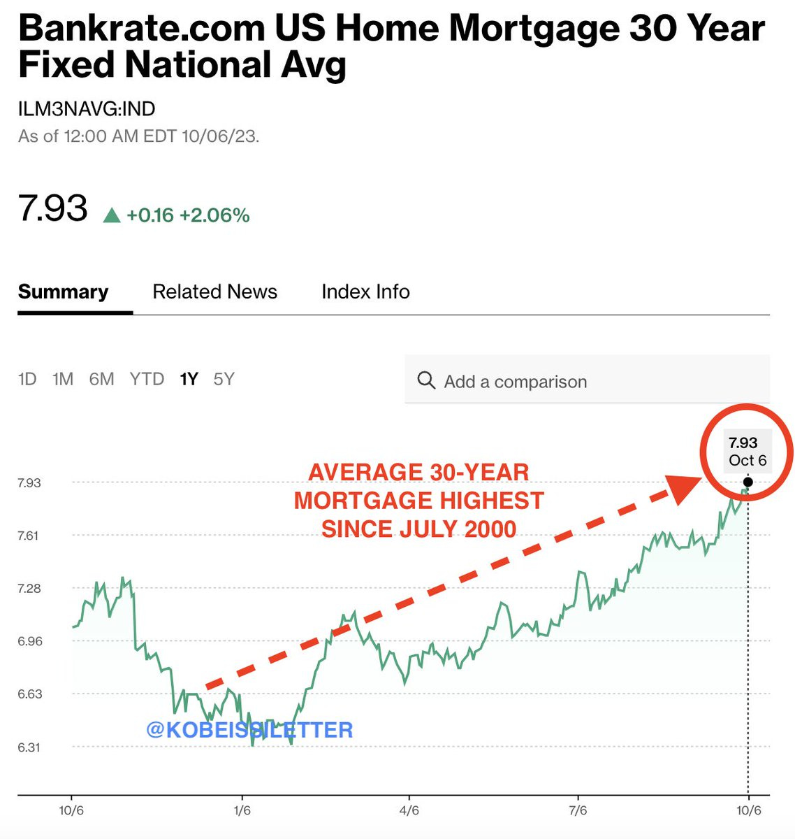 30-year mortgage rate hit 7.93% last week, highest since July 2000. In less than 3 years, mortgage rates have multiplied several times (from 2.65% in Jan 2021), making home sales the lowest in over a decade.