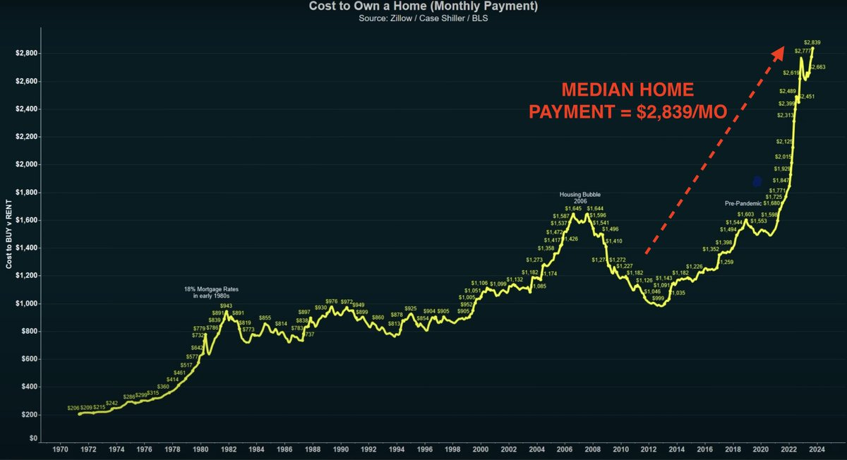 Monthly home purchase payments have risen to a record 2,839 USD/month, nearly triple in just 10 years, surging after the Covid outbreak. Home buying is becoming