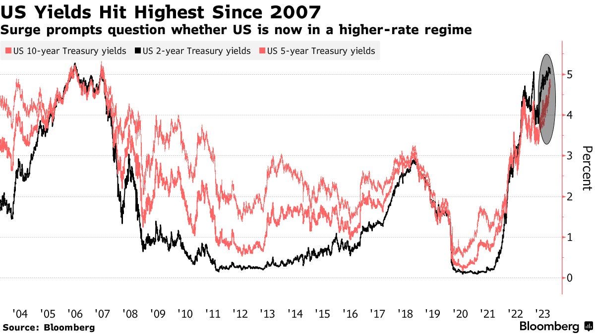 Bond yields have been rising sharply over the past few weeks, with the 10-year bond yield up about 70bps from early September, reaching 4.80% last Friday. However, according to Goldman Sachs Group, this is still not enough to threaten a recession.