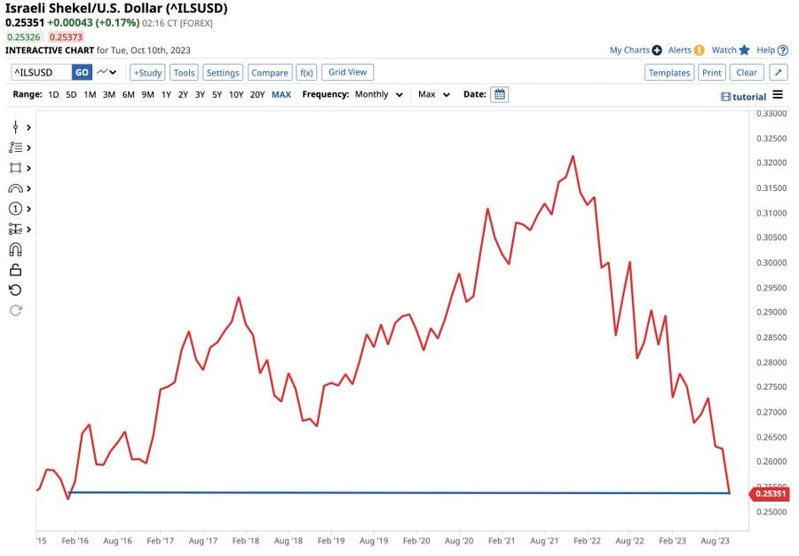 Israel's Shekel has fallen to its lowest level against the US Dollar since January 2016