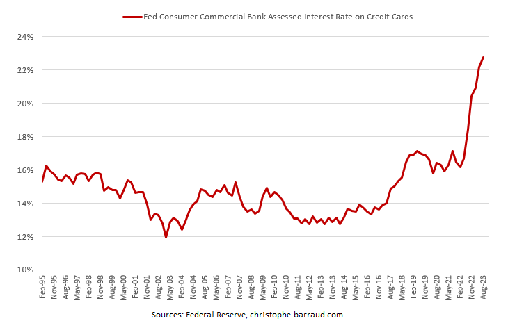 Average interest rate on U.S. credit card balances has risen to nearly 23%. With data from 1994, this is the highest rate in history.