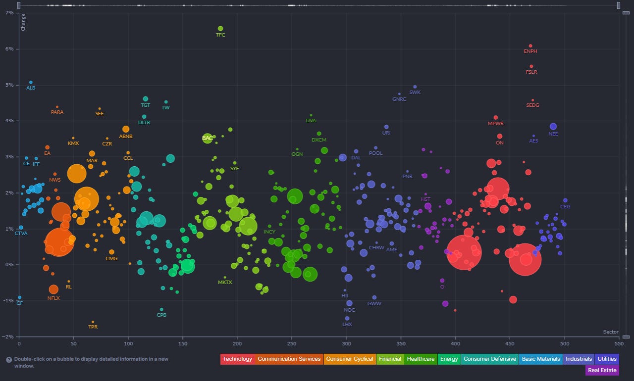 With shorts-cover rally/technical bounce from 4200 to 4300 ended, buyers push SPX to touch call wall at 4400 with buy volume completely dominating both NYSE and NASDAQ. However, above 4400, the market is “overextended” temporarily at least until end of Thursday when volatility from PPI and CPI reports disappears. Up to 12pm Central, money flow is still rotating quite evenly with mega cap tech temporarily weaker than the market.