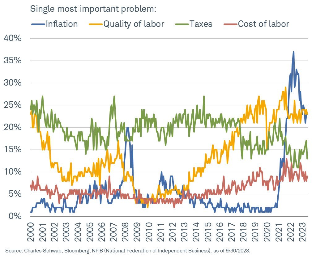 23% of business owners report that inflation remains their biggest problem in business operations. Labor quality is also a major concern.