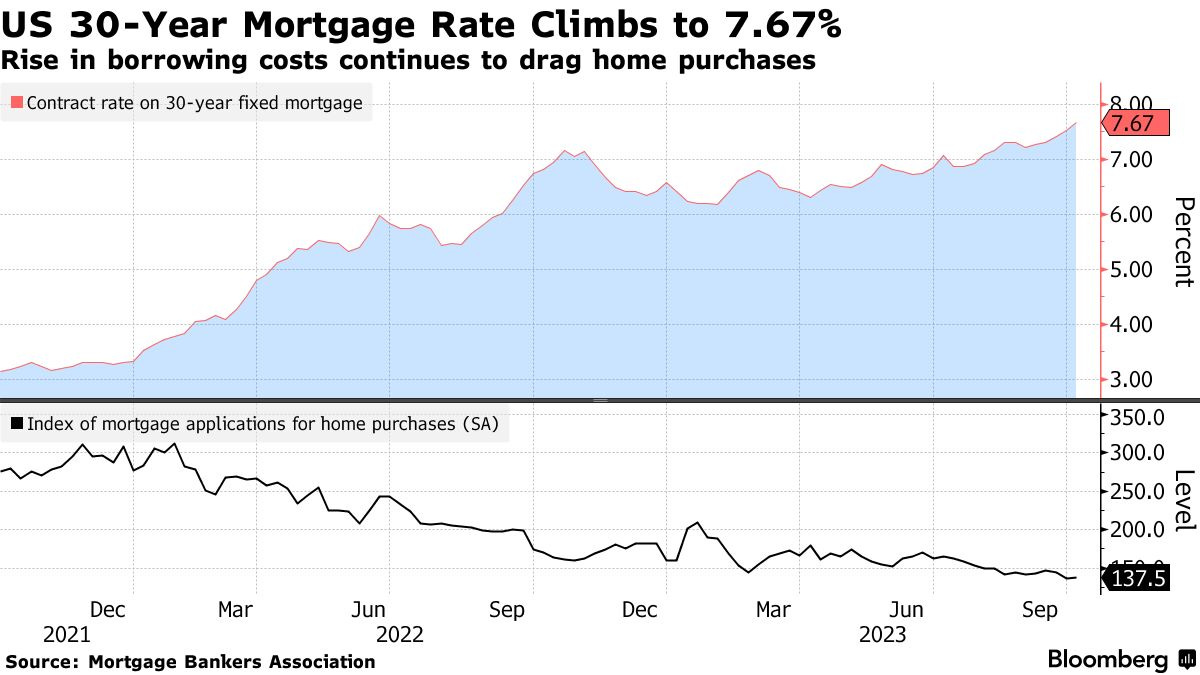 According to today's data from MBA, mortgage rates rose 14bps to 7.67%, a continuous 5-week increase pressuring home buying activity. Purchase applications index at 137.5, slightly up but still near three-decade lows.