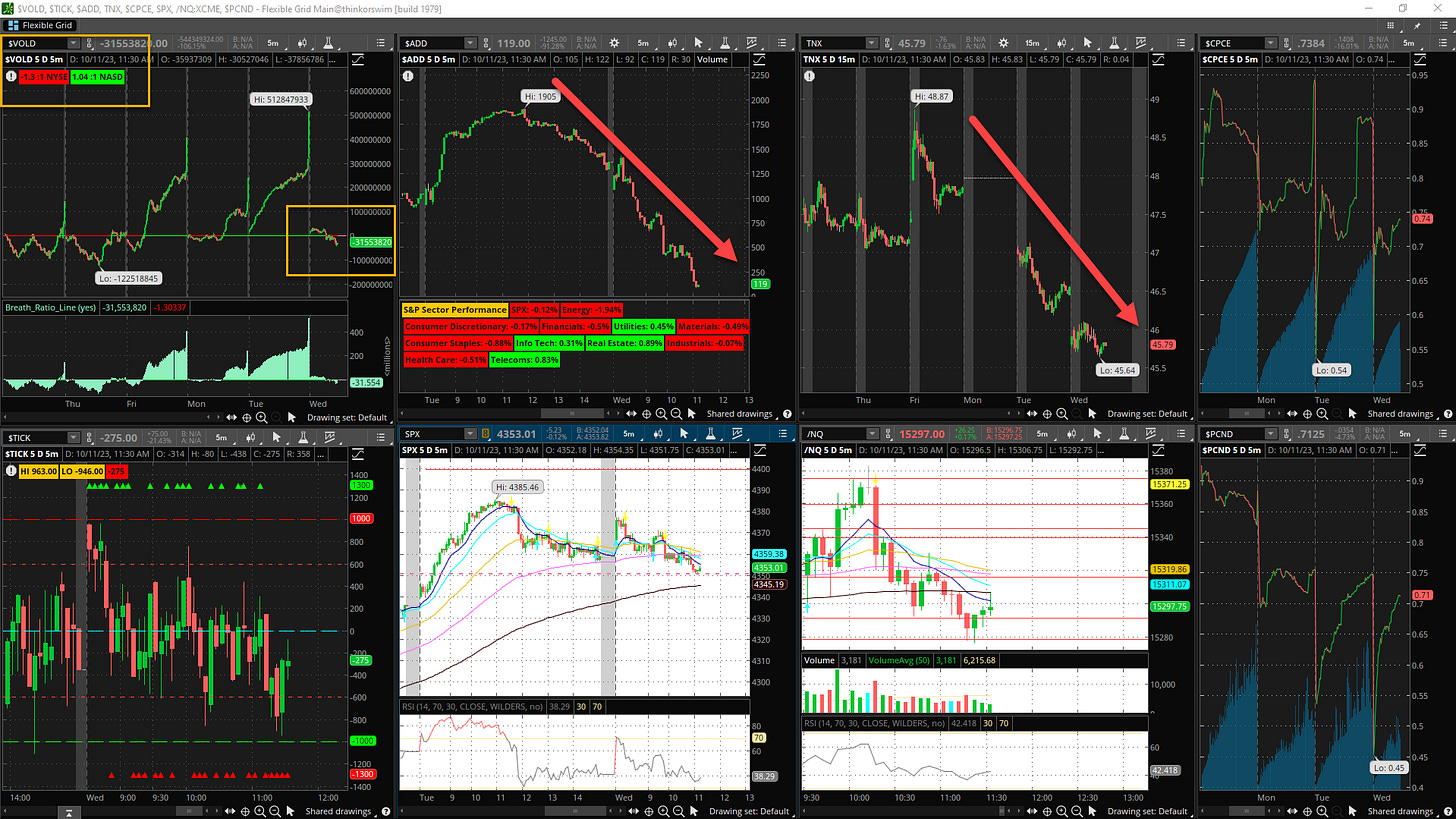 Market opened Thursday's trading session with fairly stable sentiment as bond yields continued to retreat from highs. SPX fluctuated strongly trying to touch the 4400 call wall in the first 30 minutes before the market noted a clear decline in supportive liquidity from buyers compared to yesterday, pulling SPX back before finding support at 4350.