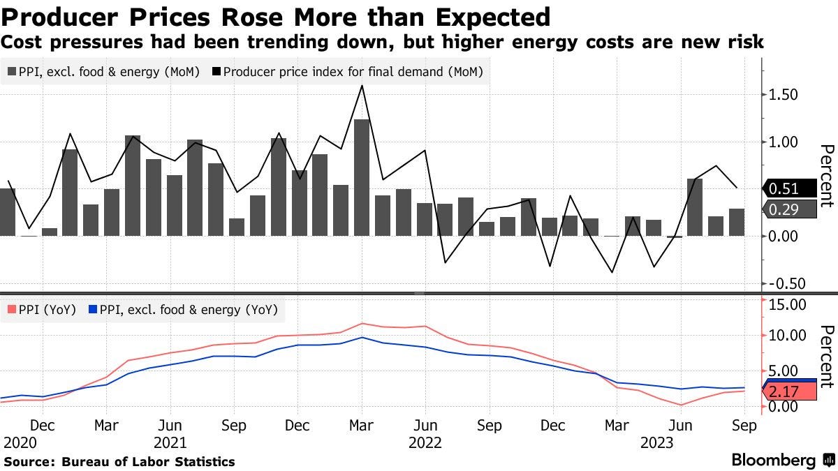 September PPI rose 0.5% from the previous month, higher than the expected 0.3% due to high energy prices, continuing to hinder the path to inflation stabilization, marking 3 consecutive months of increases. Core PPI (excluding food and energy) rose 0.3%.
