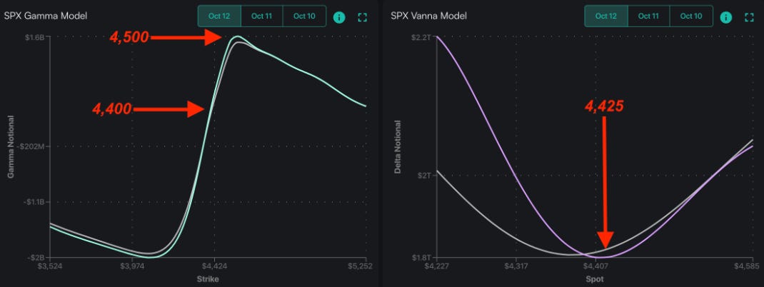 US stock market opens Thursday's trading session with focus on September CPI report. Before today, gamma flow has been mostly bullish with volatility sellers almost completely absent over the past 4 days. As noted in newsletter 10/05, most hedges have been shifted to the first week of November to cover FOMC, creating a "quiet" period in the market that allows capital flows to recover. SPX call wall has been pushed up to 4500 while volatility hits bottom around upper 4425.