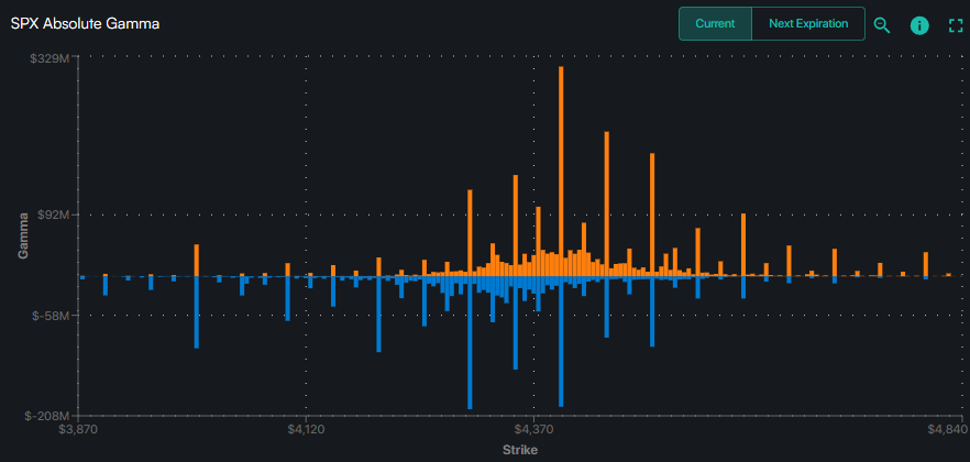 Overall, the market maintains a clear bullish state with next gamma level at 4400. Unlike previous days, SPX call wall has been pushed to 4500 so the area above 4400 is no longer considered "over-extended" for the index. However, with liquidity remaining low, SPX will mostly continue trading in the 4350-4400 range until end of day.