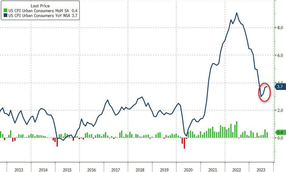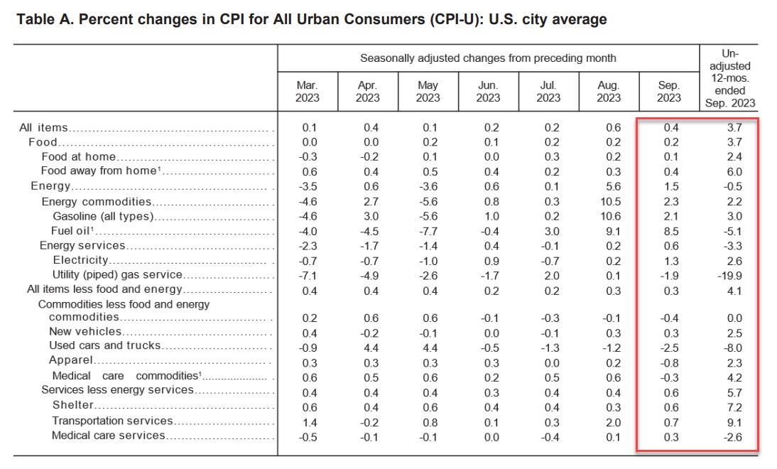 September CPI up 0.4% MoM and 3.7% YoY. Both figures higher than economists' forecasts of 0.3% and 3.6% respectively. This is the third consecutive month YoY CPI has risen higher than the previous month.