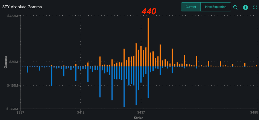SPY's resistance at 440 also coincides with VIX options expiration tomorrow featuring a large volume of 15P and 20C expiring. After tomorrow's VIX OpEx, market volatility will largely increase heading into Friday's OpEx, adding downside risk toward SPY's key put wall at 430.