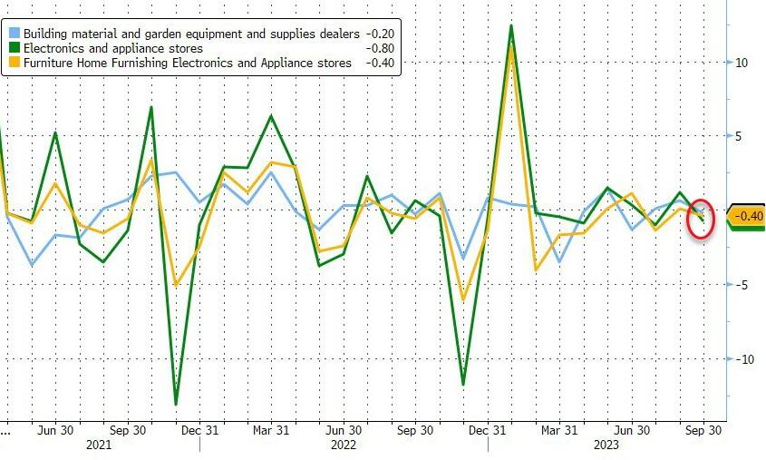 Some signs point to housing market weakness. Sales of building materials, electrical equipment, appliances, and furniture all fell from previous month.