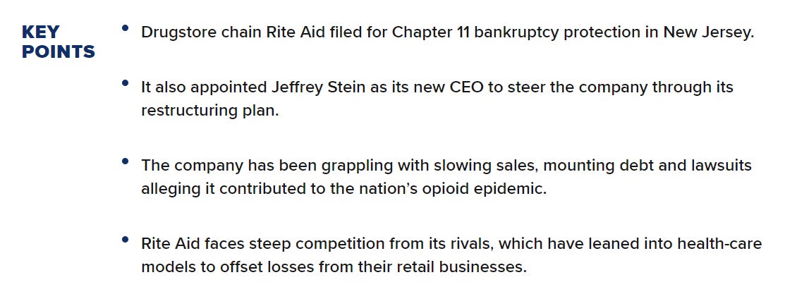 Drugstore chain Rite Aid officially files for bankruptcy days after 61st anniversary celebration. Company recorded over $2 billion in losses over past 5 years, closing 50% of stores. Stock