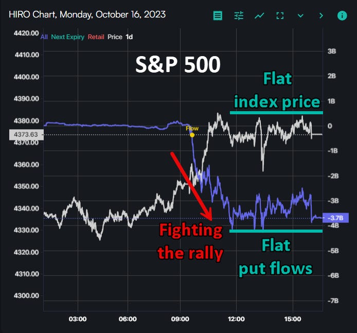 However, noteworthy is that from yesterday to today, negative delta across the market continues to hold SPY's call wall at 440 while SPX's call wall rises to 4450. Currently, 440 is a key level for SPY in this week's October OpEx, with high likelihood SPY will pull back here and fail to break 440 at least until OpEx ends. Investor and trader sentiment and actions from yesterday and today largely reinforce this view.