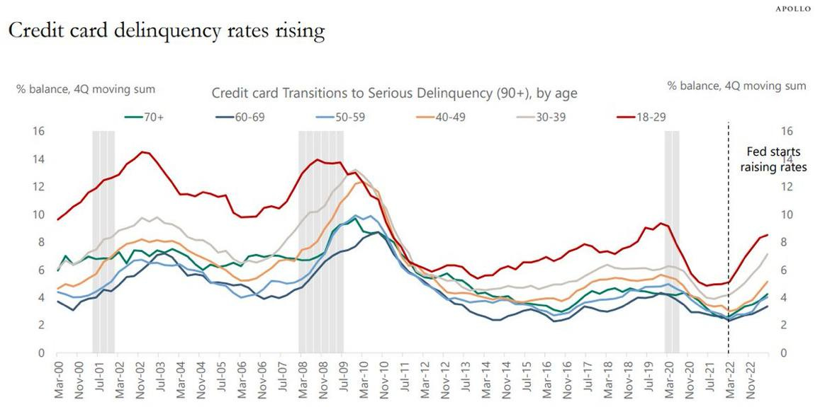 Delinquency rate on credit card debt for 18-29 year olds now at 9%.