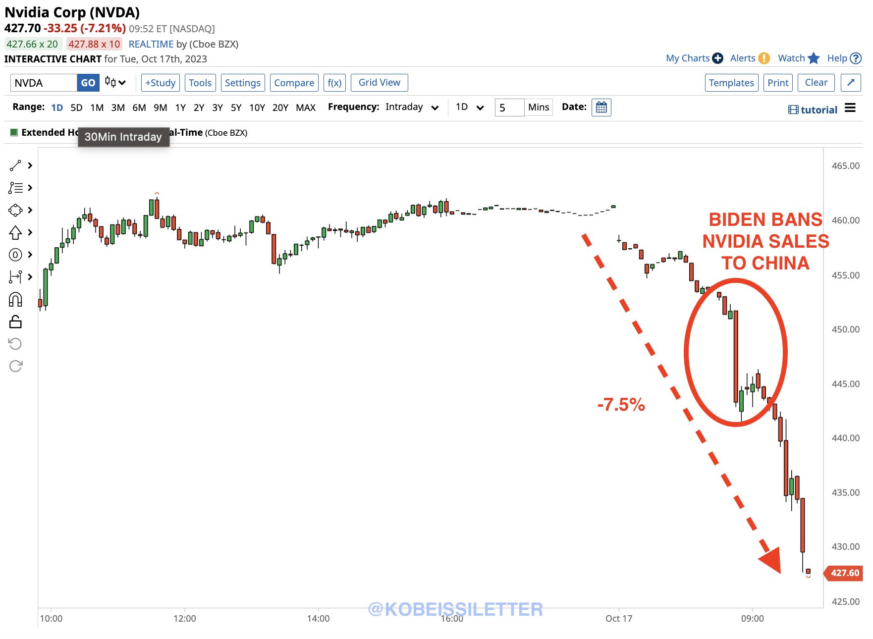 Nvidia stock, plunged due to President Biden restricting AI chip sales to China. The stock evaporated nearly $100 billion in value in just over 24 hours.