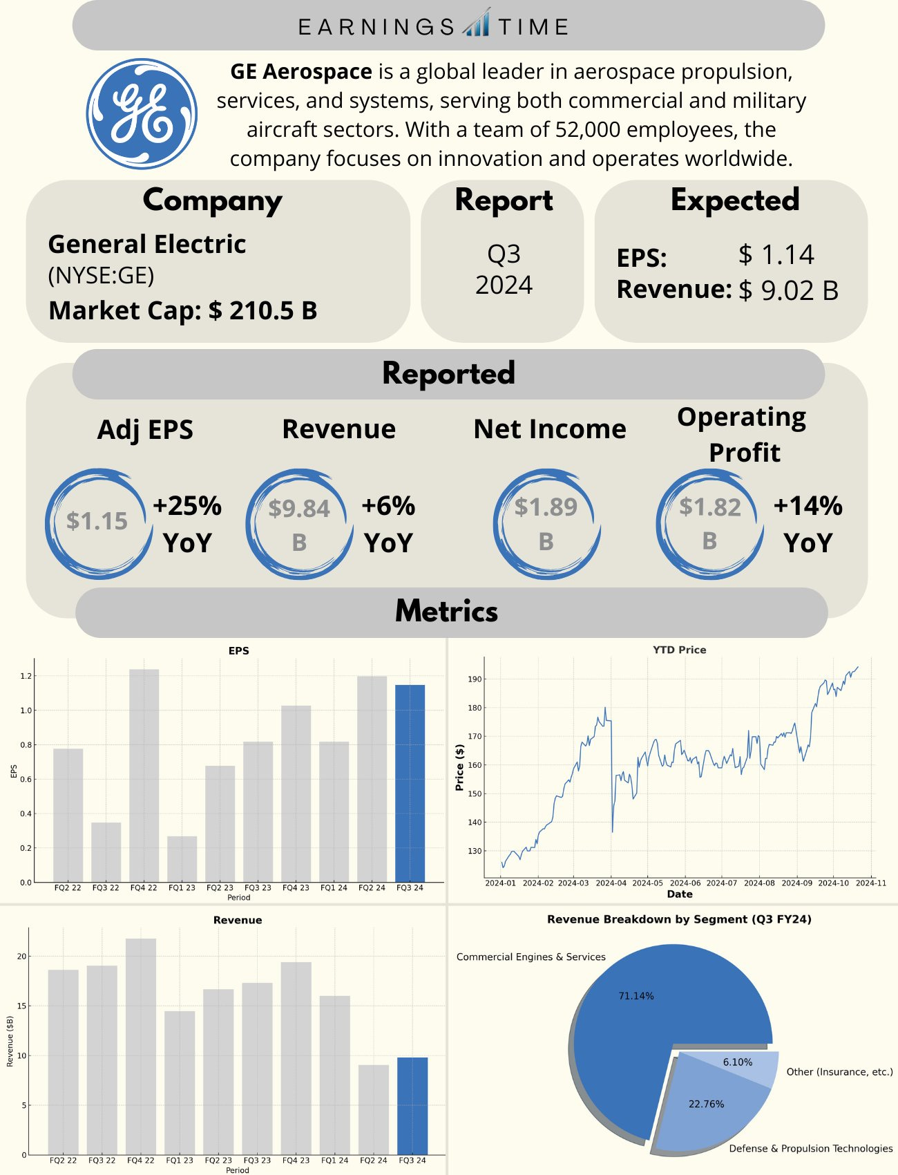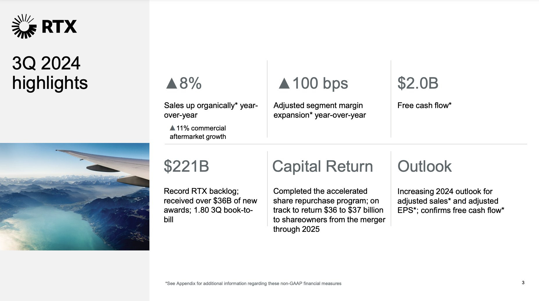 Stock down due to weak commercial aircraft engine deliveries, largely from overall demand decline and Boeing strike.
