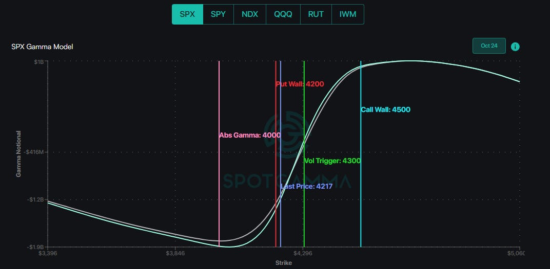 Overall, if the above 3 conditions continue to be maintained, SPY and the market in general are likely to recover in the next 2 days or until SPY/SPX hits vol trigger 430/4300. At 430/4300, if shorts-cover rally from options positions becomes flat gamma (out of fuel), if buyers decide to support buying equities, VIX will return below 18 and create conditions for the rally to continue to SPY/SPX ~440/4400 call wall. - Viet Hustler 10/23