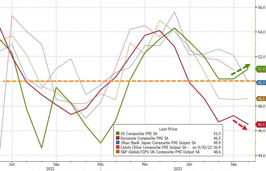 Eurozone October preliminary PMI down 0.6 points to 46.5, below expectations, due to services sector decline. The US is currently the only region where PMI did not decline.