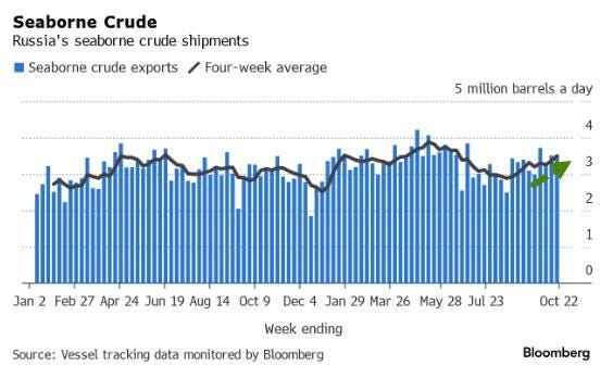 Bloomberg reports Russia's oil flows steadily increasing as Moscow complies with pact with Saudi Arabia to prevent weakening of oil exports to global markets.