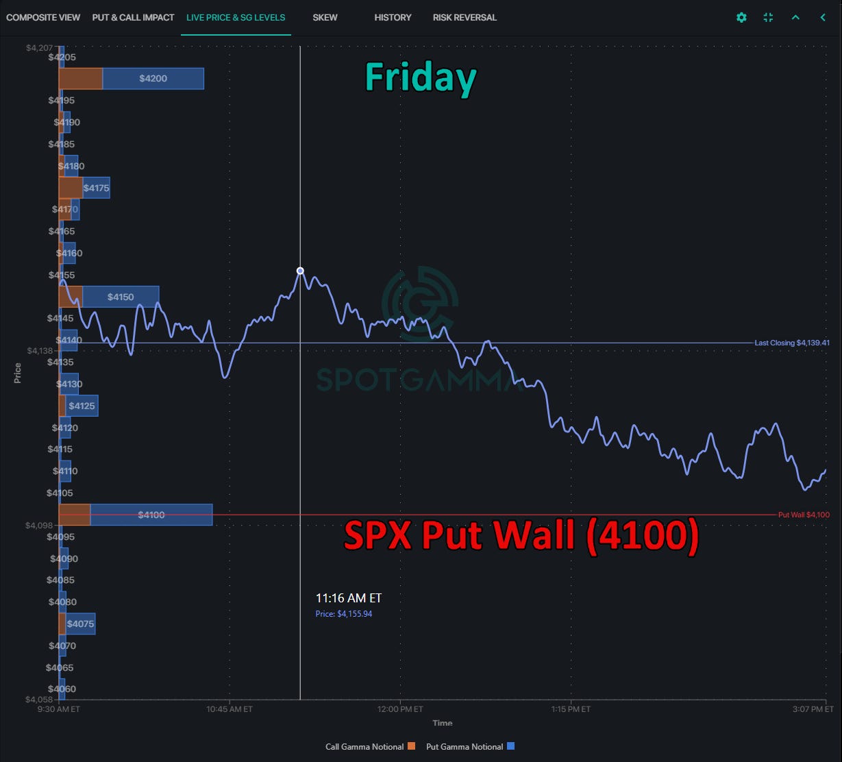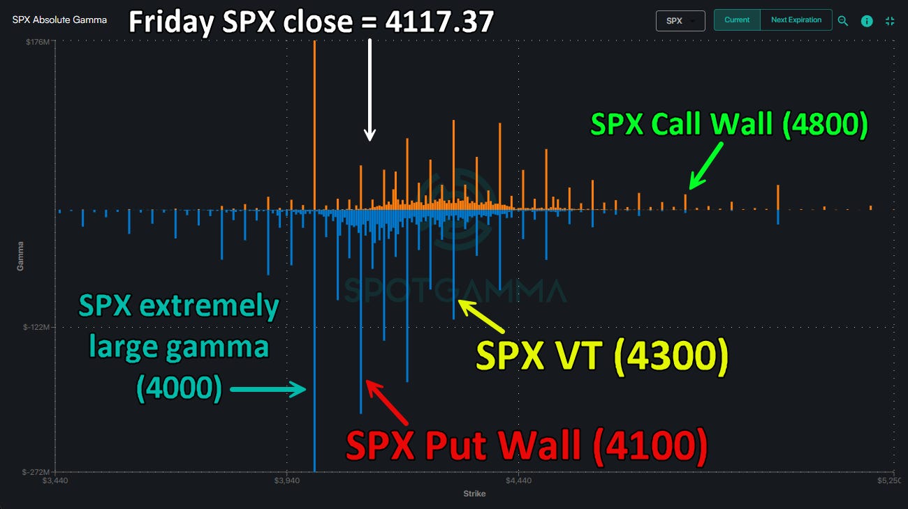 SPX Put Wall moved down to 4100 on Friday, creating a magnet pulling the market down near the put wall before finding buying support. As a result, the market is entirely in the negative gamma zone with VIX above 20.