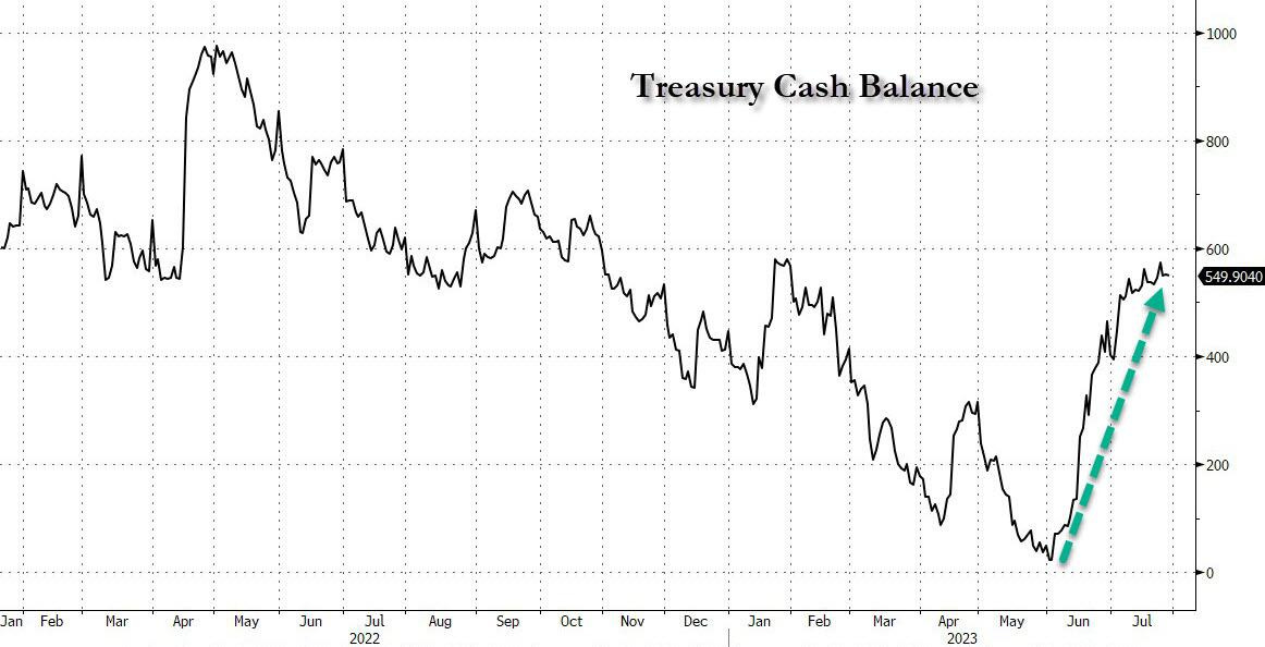 The US Treasury's cash balance has increased by more than half a trillion dollars as Secretary Janet Yellen timely replenished cash, deposited at the Fed in the form of the Treasury General Account.
