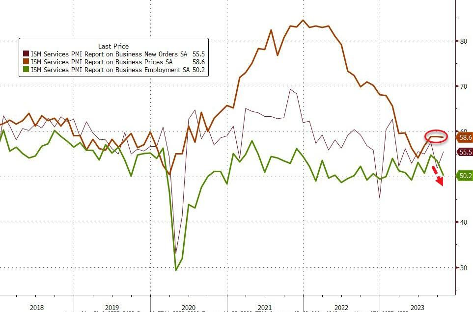 ISM survey shows prices paid significantly higher than expected and employment drops sharply.
