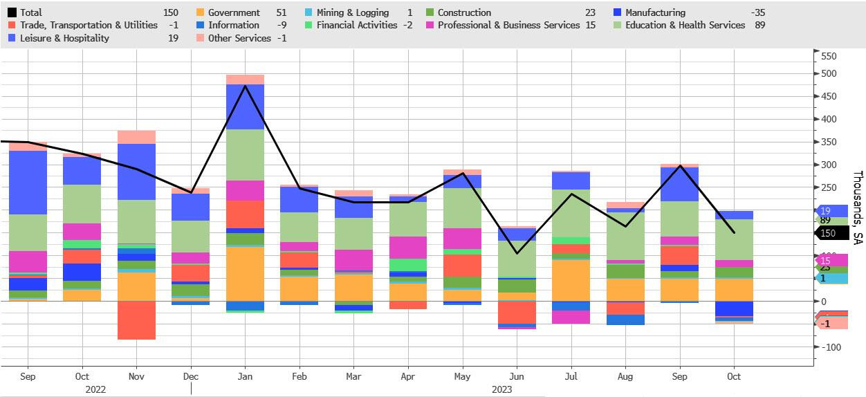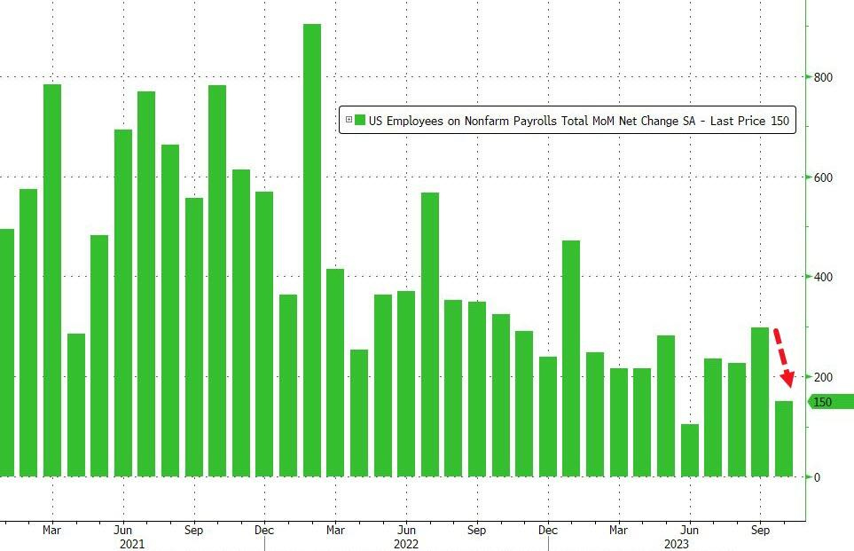 US economy adds 150,000 jobs in October, below expectations of 180,000 and sharply down from September's 336,000. This is the 2nd lowest level in the past 3 years.