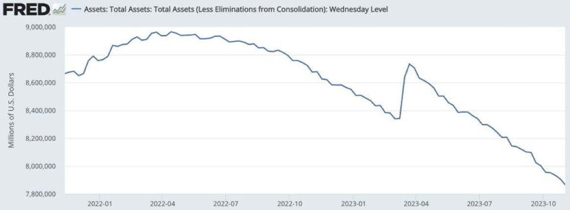 Fed balance sheet fell another 41 billion USD this week, now down 1.1 trillion USD from April 2022 peak.
