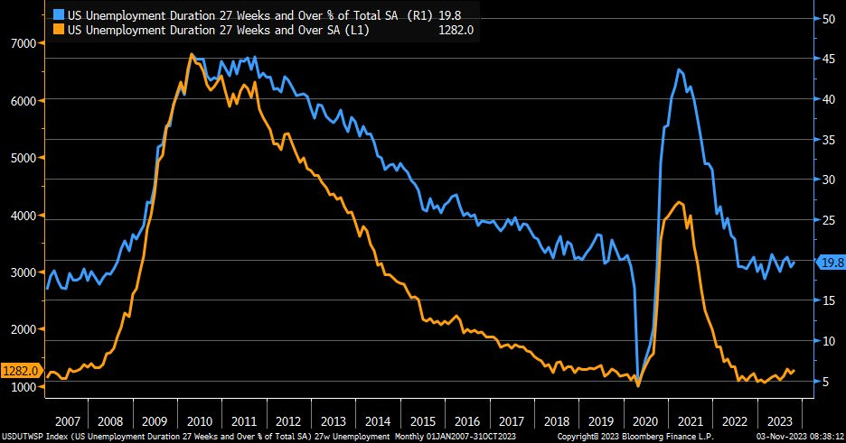 Number of unemployed in the past 27 weeks unchanged, but total unemployed this year has increased.