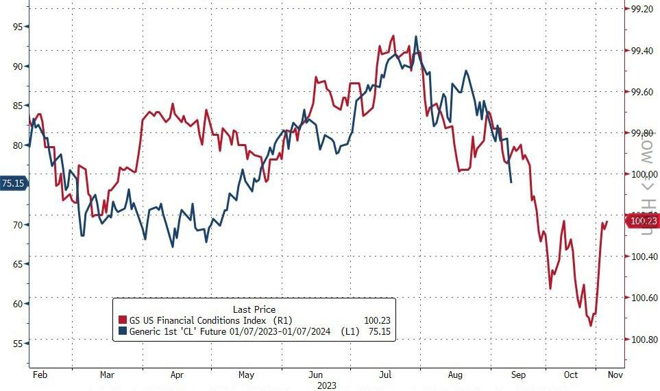 Crude oil tends to follow looser financial conditions with a 2-month lag