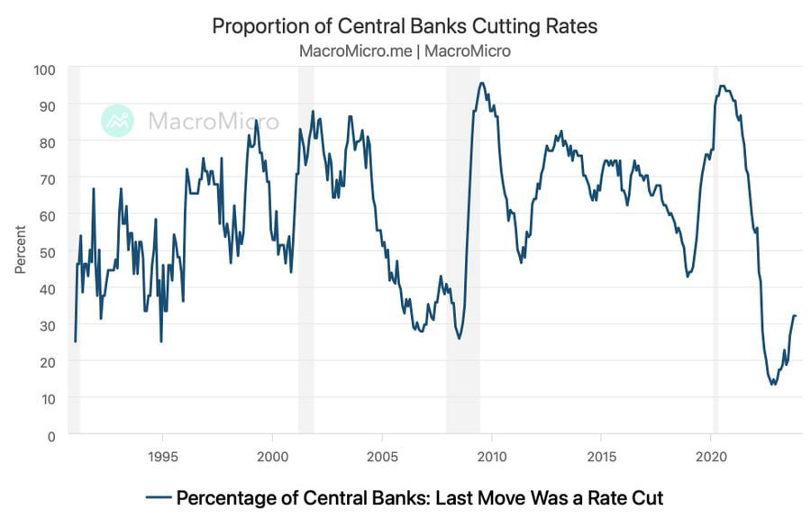 32% of global central banks have started cutting rates, trend of central banks pausing rate hikes is increasing.