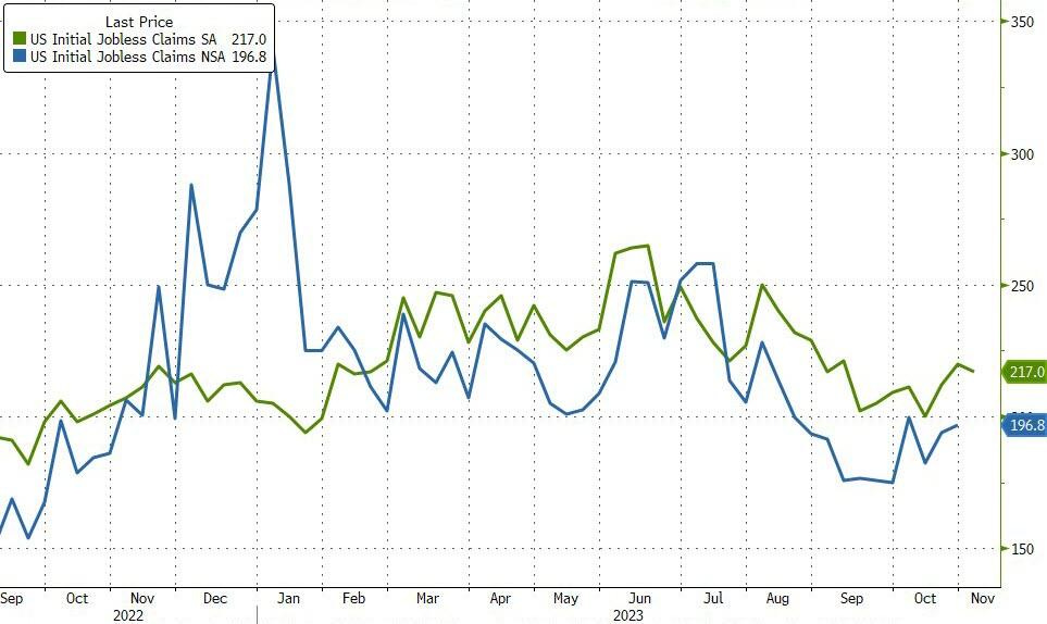 Initial jobless claims last week fell to 217,000, down from 220,000 the previous week, hovering near the lowest levels so far this year.