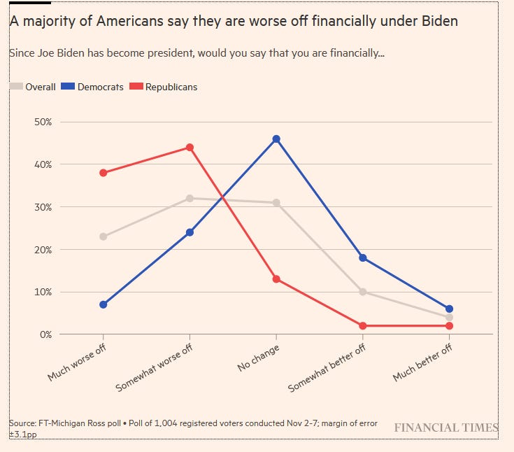 Only 14% of voters believe Joe Biden has improved the economy and brought benefits to their lives (according to Financial Times survey).