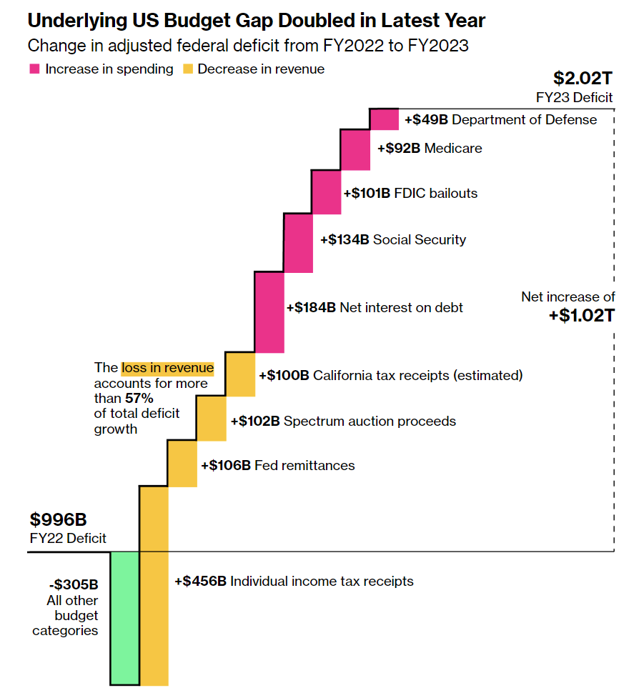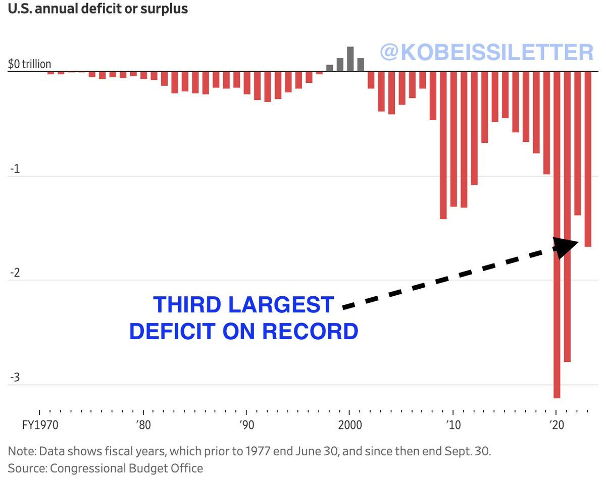 US 2023 deficit reached -1.7 trillion USD, additional -300 billion USD deficit compared to last year. Spending now accounts for 44% GDP, equal to World War II.
