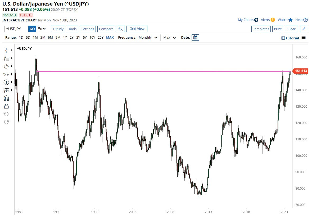 The Japanese Yen is approaching its lowest level in 33 years against the USD.