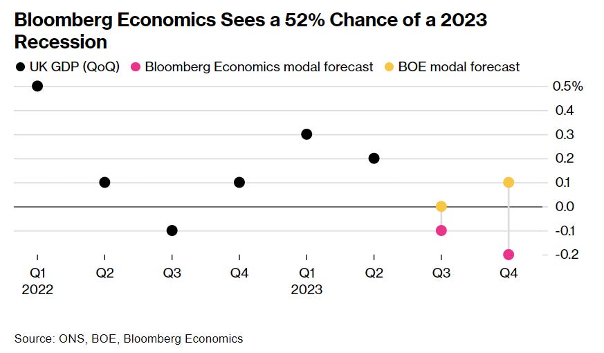 According to Bloomberg Economics, 52% chance UK will fall into recession due to sharp interest rate hikes and rising unemployment, forcing households to cut spending.