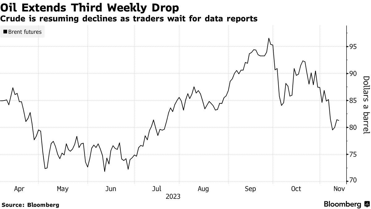 Brent oil price falls for three consecutive weeks below 81 USD/barrel due to concerns about global demand and the risk premium in the Israel-Hamas war has also decreased.