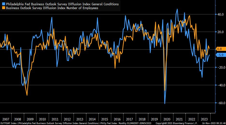 November Philadelphia Fed manufacturing index -5.9, better than expected -9.0 but still low.