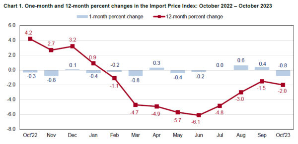 Import price index fell -0.8% MoM in October (more than expected: -0.3%), mainly due to fuel import prices falling -6.3% MoM for the first time in 5 months.